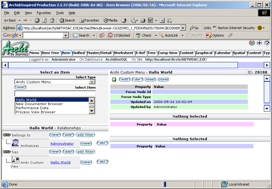 For this exercise, let's name them both "Hello World". Now link the new instance of the "Archi Custom View" nodetype to the new instance of the "Archi Custom Menu" nodetype via the "has" reltype.