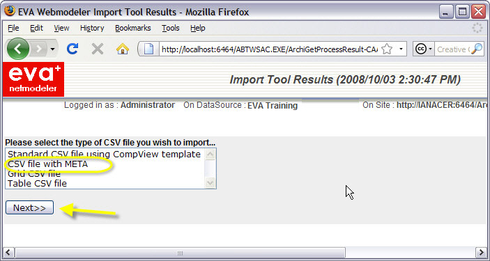 - EVA Netmodeler will then ask you to identify the type of CSV file being imported: